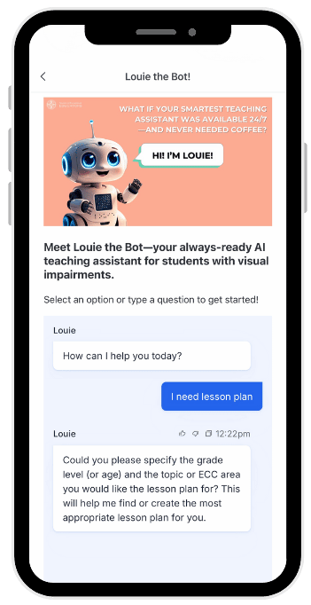 It helps you teach confidently with ready made lesson plans, monthly CEU workshops, hands-on activities, and Louie – the first AI Assistant designed specifically for educators of VI Students.